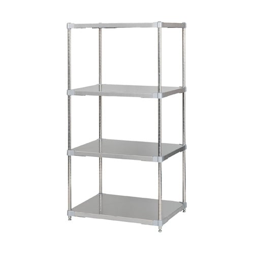 棚板・SUS304ステンレス、コーナー部・アルミダイキャスト(紛体塗装)、ポール・SUS304ステンレス、キャップ・ナイロン、アジャスター・SUS304ステンレス、テーパースリーブ・ABS樹脂