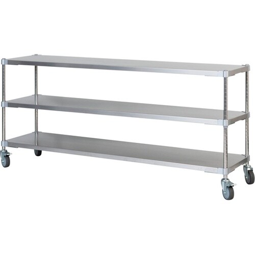棚板・SUS304ステンレス、コーナー部・アルミダイキャスト(紛体塗装)、ポール・SUS304ステンレス、キャップ・ナイロン、アジャスター・SUS304ステンレス、テーパースリーブ・ABS樹脂、キャスター・スチール
