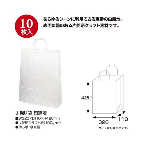 衣料・雑貨屋など幅広く利用される、ベーシックな無地のシンプルな手提げバッグ(紙袋)です。あらゆるシーンに利用できる定番の白無地。 |