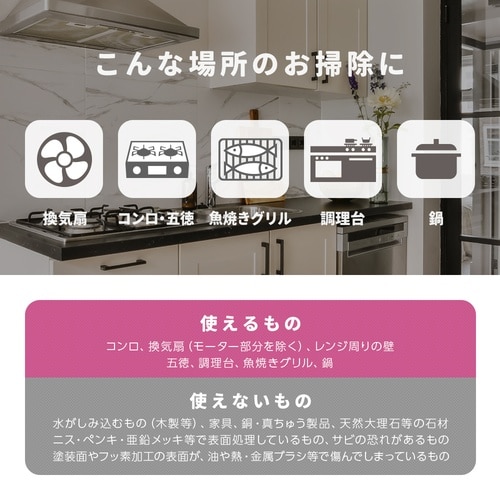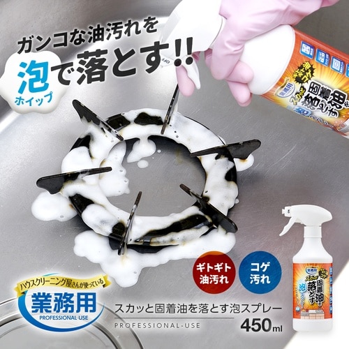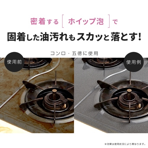 密着するホイップ泡で固着した油汚れもスカッと落とす。ギトギト油汚れやコゲにホイップ泡が密着し汚れを包み込んで落としてくれます。 |