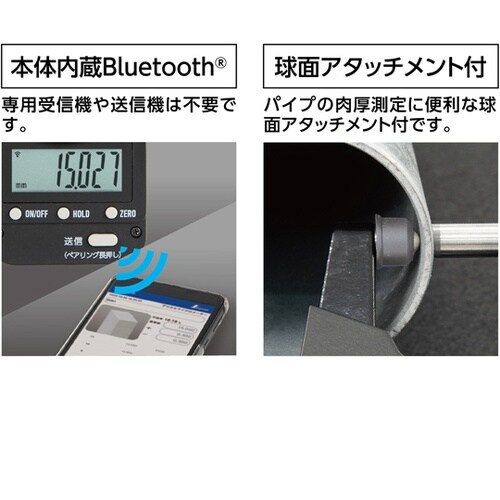防塵防水でデータ転送できるデジタルマイクロメーターです。BluetoothR通信機能付で、測定値をスマートフォンやタブレット、パソコンに送信できます。デジタルユニット部は防塵・防水性能IP65です。 |