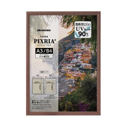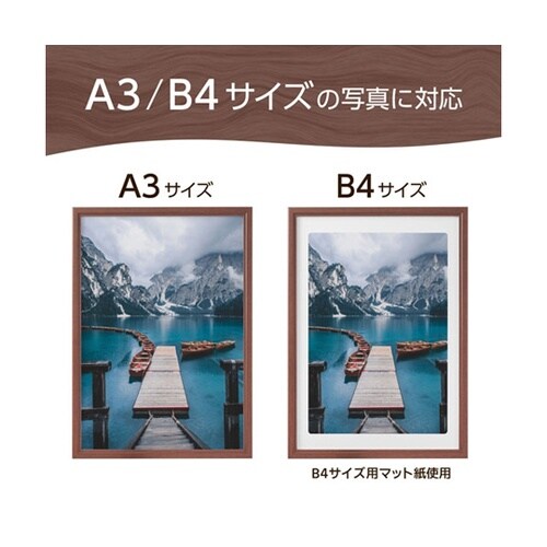 シンプルなデザインでUVカットPET板を使用したA3サイズ用の木製額縁。B4サイズも飾れるマット紙(中額)付き。 |