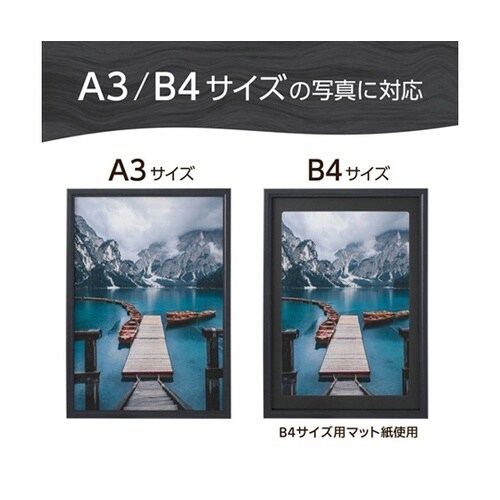 シンプルなデザインでUVカットPET板を使用したA3サイズ用の木製額縁。B4サイズも飾れるマット紙(中額)付き。