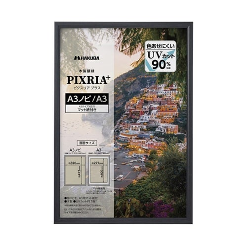 シンプルなデザインでUVカットPET板を使用したA3ノビサイズ用の木製額縁。A3サイズも飾れるマット紙(中額)付き。 |