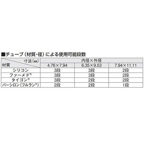 サイズの異なる3種類のチューブに対応。豊富な機能。幅広い流量、異なるサイズのチューブにも対応サイズごとにチューブ押えの交換をすることなく、サイズの異なる3種類のチューブをセットすることができます。 |