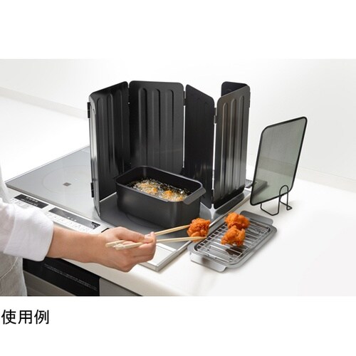 料理中の油ハネ・飛び散りを効果的に防ぐアイテムです。蛇腹に折りたたんだパネルを広げるだけで簡単に設置できます。壁面にこびりつく油汚れも減少し、お掃除の手間を軽減します。 |