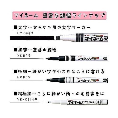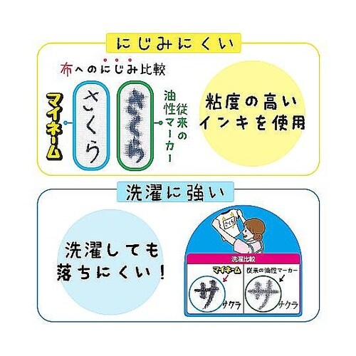 インキ粘度が約2倍だから布に書いてもにじみにくく、洗濯しても落ちにくいです布・ビニール・金属・プラスチックなどへの名前書きに適しています。算数セットからゼッケンまで書ける幅広い線幅ラインナップです。 |