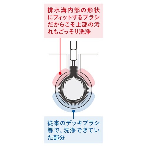 丸型排水ピットにフィットし、上部や狭い入口部分の汚れまで一度に洗浄可能。従来の清掃では手が届きにかった場所まで、毛腰のあるブラシがしっかりかき出します。 |
