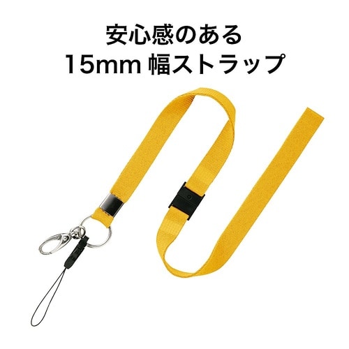 安心感のある15mm幅ストラップです。名札用ケースや鍵などが付けられるフック付きです。携帯電話やペンがワンタッチで脱着できるパーツ付き。強く引っ張ると安全装置が働き事故を防止する安全装置付きです。 |