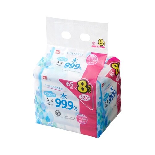 成分の99.9%以上が純水でできた、手や口にも使えるウェットシートです。シート65枚入×8個パックです。持ち歩きに便利なコンパクトサイズです。無香料、ノンアルコール、パラベンフリーです。 |