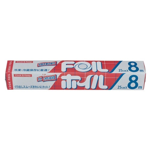 25cm幅の食品用アルミホイルです。カットしやすいBOXタイプです。端末にシール止めが付いているので、はがしやすくムダなく使用できます。 |