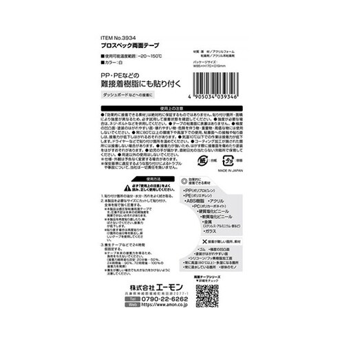 製品コード:3934 | 製品名:プロスペック両面テープ | サイズ:長さ1m×幅15×厚さ1.1mm | 使用可能温度範囲:−20ー150℃ | カ…