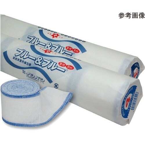 実技実習用綿ホータイです。両耳に青ラインが入っているので巻き具合が一目でわかります。厚手の包帯の為耐久性に優れています。 |