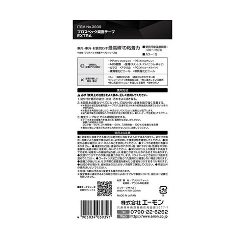 製品コード:3939 | 製品名:プロスペック両面テープ EXTRA | サイズ:長さ140×幅75×厚さ1.6mm | 使用可能温度範囲:−20ー1…