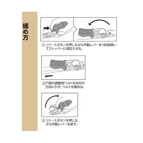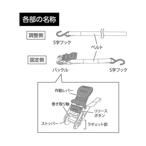 積み荷の固定や、運搬時の荷崩れ防止に!ラチェット式でしっかり固定ができる。 |
