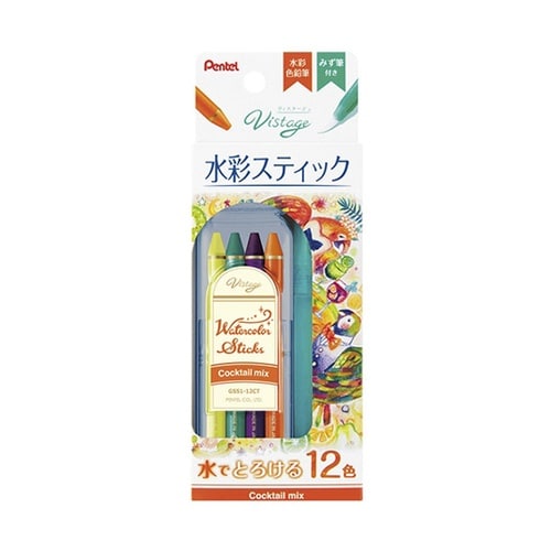 ぺんてる 水彩色鉛筆 ヴィスタージュ 水彩スティック カクテルミックス セット 12色 水筆付き GSS1−12CT 1セット A09G-2391