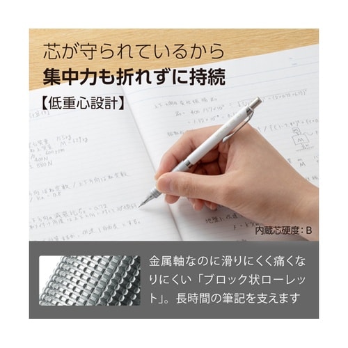 ワンノックで書き出せる。極細の芯でも折れずに、長く書き続けられます。メタルグリップには従来のギザギザとしたローレットではなく、角が立っていないブロック状のローレットを採用。 |