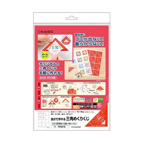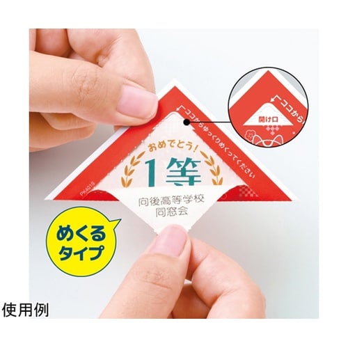 印刷してからはがして貼り合わせるだけ!はさみ・のり不要でオリジナルの三角くじが手軽に作れます。めくって開封できるので、切り取った後のゴミが出ません。 |