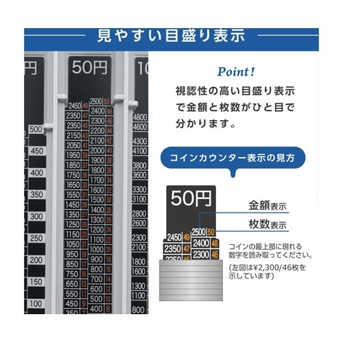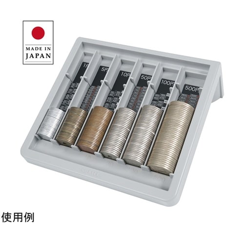 硬貨の集計に便利なコインカウンター。金額と枚数が一目で分かるメモリ表示付き。硬貨をまとめて出し入れできます。 |