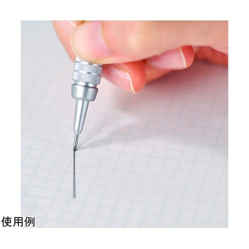 筆記時に線や文字を確認できる細身のペン先。安定した筆記を得るための低重心設計。定規をあてやすい4mm先端パイプ。手のすべりを防ぐローレット加工。芯の硬度が使い分けできる表示窓付き。