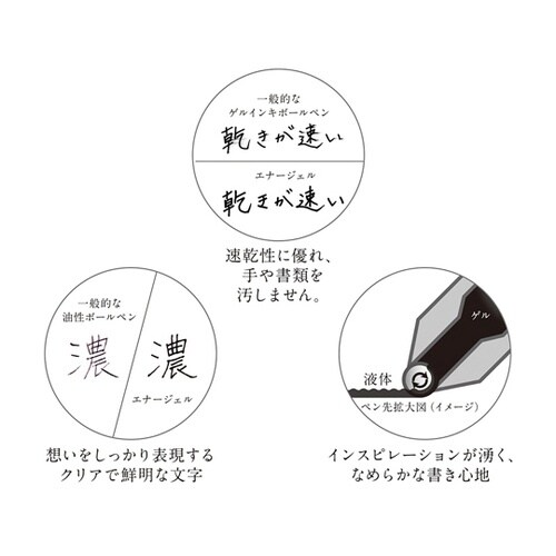 スッと書けてサッと乾く、エナージェルインキ採用。統一感ある生成り色の軸とストライプ柄は上品さや個性を表現し、ふんわりしつつもクラシックな雰囲気纏うエナージェルです。