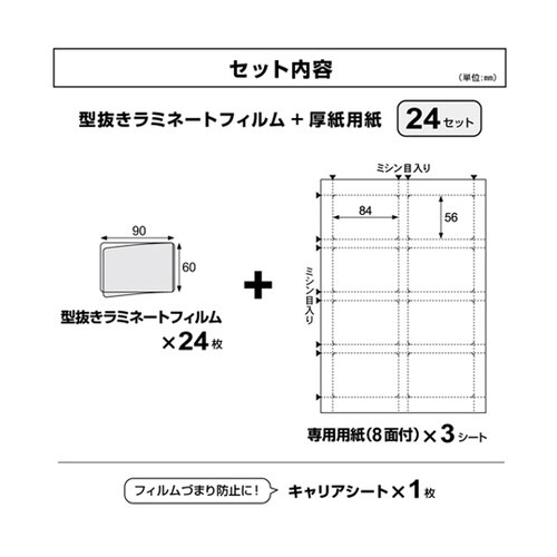 ぴったりサイズの用紙とフィルムがセットになっているのですぐにカードが作成できます。ミシン目入りの用紙でハサミやカッター不要!IDカード、診察券からトレーディングカード、食券まで。 |