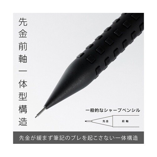 先金と軸一体構造でブレない安定した書き心地。手になじみ、しっかり握れる金属×ラバーグリップ。芯硬度表示窓付き。大型ラバーノック。 |