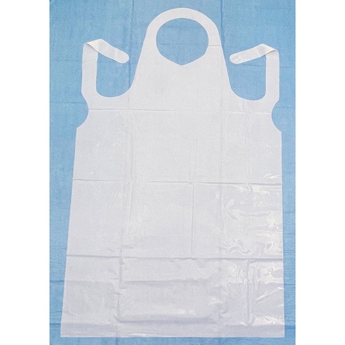 袖なしタイプのエプロンです。ポリエチレン素材にエンボス加工を施しております。首回りの後ろに切れ目が入っておりますので、引っ張ると容易に脱ぐことができます。 |