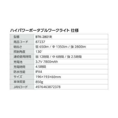 BTK−2801R ハイパワーポータブルワークライト 87237 1個