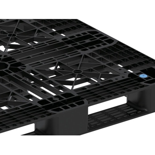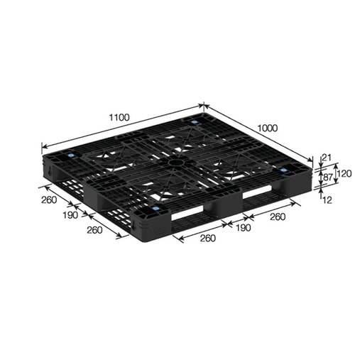 メーカーの1000×1100mmサイズで最も軽量なパレットです。デッキ面(桁間)のリブ配置を従来の「井」形状から「風車」形状とすることでデッキ面の変形を抑えます。 |