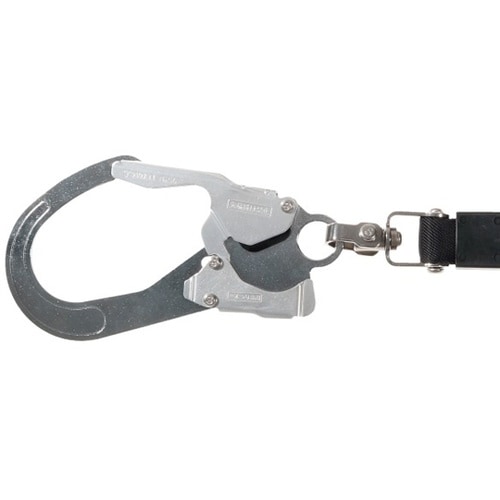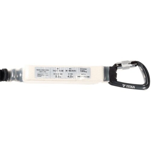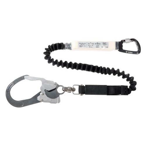 胴ベルト型・ハーネス型のどちらにも使えるランヤード。コンパクトな長さから、作業中は必要に応じて伸びる、伸縮ストラップ式のタイプ1ランヤード。墜落制止用器具の規格、新規格品。シングルランヤード。 |