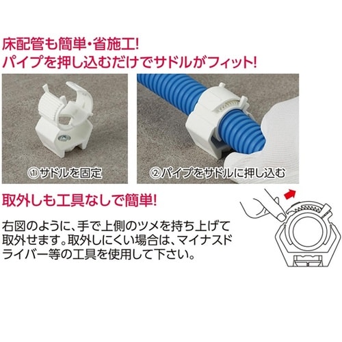 コルゲートイージーカポリ専用のサドルです。配管固定後もマイナスドライバー等で取外しが可能です。パイプを押し込むだけで固定できるので施工性が向上します。コルゲートイージーカポリ専用。 |