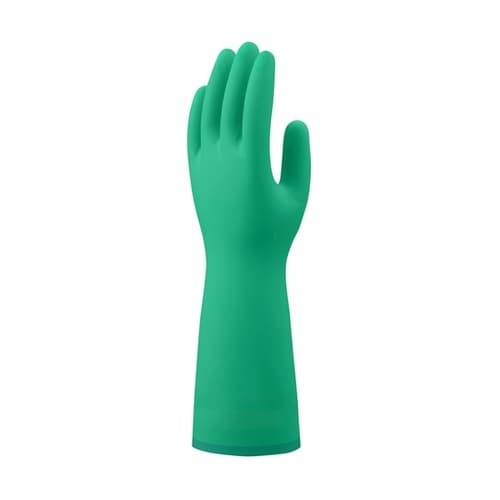 JIS T 8116に準拠した化学防護手袋です。油・酸性・アルカリ性の薬品の透過を防ぎ、経皮吸収のリスクから作業者を保護します。指と手のひら部分にスベリ止め加工を施しています。裏毛付きタイプです。 |
