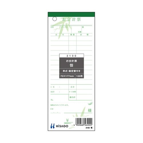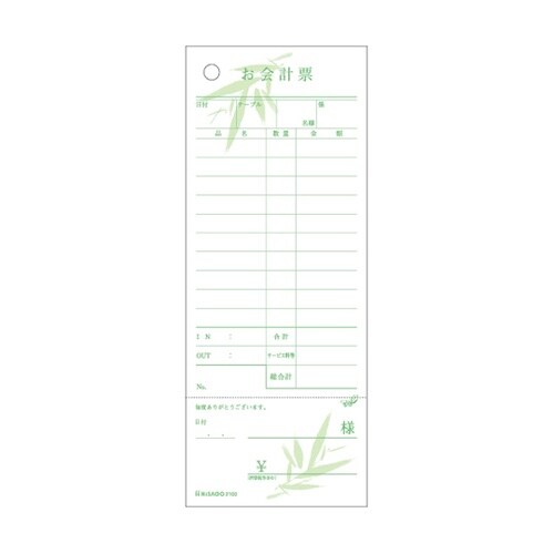 勘定書付きのお会計票。笹をあしらった風流なデザインが、寿司処、蕎麦屋などの麺処や和食のお店などにおすすめです。来店時間も記入できます。100枚で1冊に製本されています。 |
