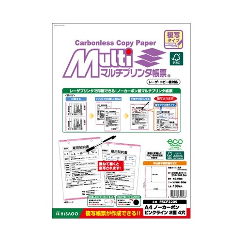 FSC認証 マルチプリンタ帳票 複写タイプ A4 ノーカーボン ピンクライン 2面 4穴 1パック(100枚入) FSCF2209 1パック