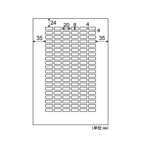 サイズ:A4タテ 210×297mm | 紙厚:0.14mm | ラベルサイズ:20×8mm | 面付:120(6×20) | 単位:1パック