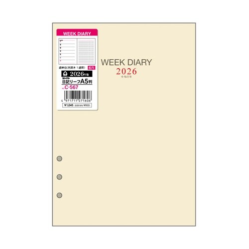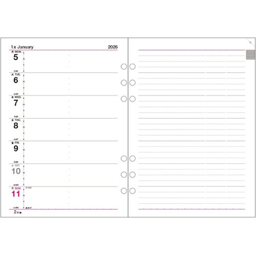 A5判6穴システム手帳のリフィルとして使える見開き1週間ダイアリーです。 |