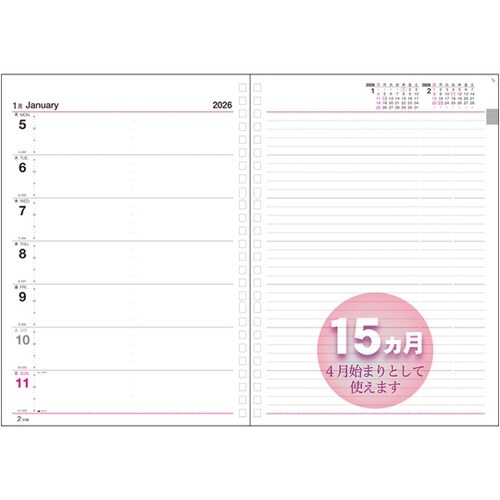 見開き性に優れて左右頁の行が段違いにならないワイヤリングとじ形式の見開き1週間15ヶ月ダイアリーです。