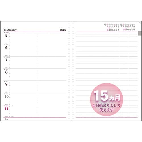 リングバインダーのリフィルとして使える見開き1週間15ヶ月ダイアリーです。 |