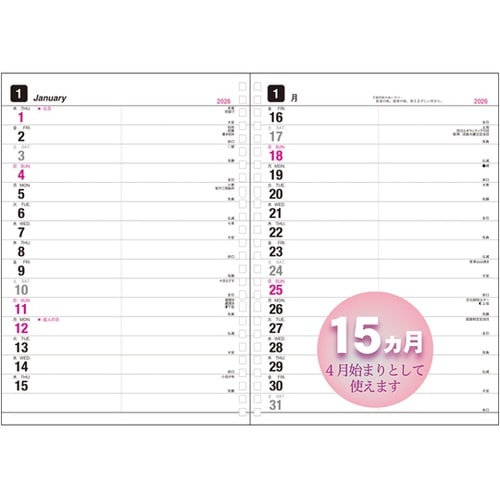 見開き性に優れて左右頁の行が段違いにならないワイヤリングとじ形式の見開き1ヶ月ダイアリーです。 |