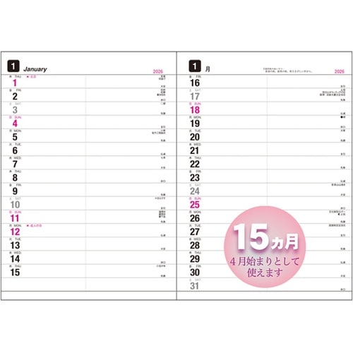 厚みがなくコンパクトな製本形式の糸かかりとじの見開き1ヶ月ダイアリーです。