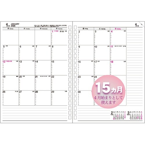 リングバインダーのリフィルとして使えるブロックタイプの見開き1ヶ月ダイアリーです。