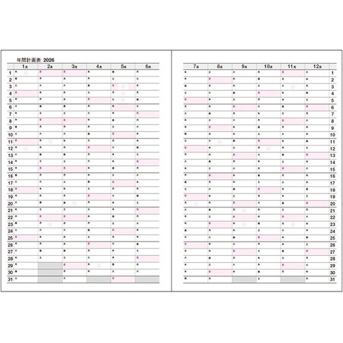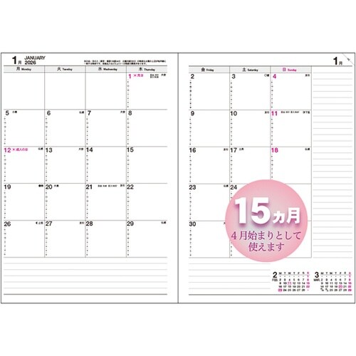 背がしなやかでとじ目まで開きやすい糸かがりとじ製本のブロックタイプ見開き1ヶ月ダイアリーです。 |