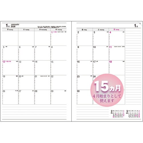 背がしなやかでとじ目まで開きやすい糸かがりとじ製本のブロックタイプ見開き1ヶ月ダイアリーです。
