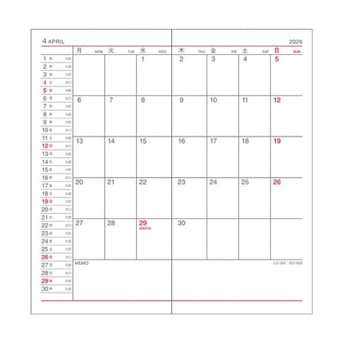 色:レッド。 | 規格サイズ:手帳。 | 表紙素材:加工紙。 | ページ数:36。 | 始まり曜日:月曜日。 | 始まり月:12月。 | 主レイアウト…