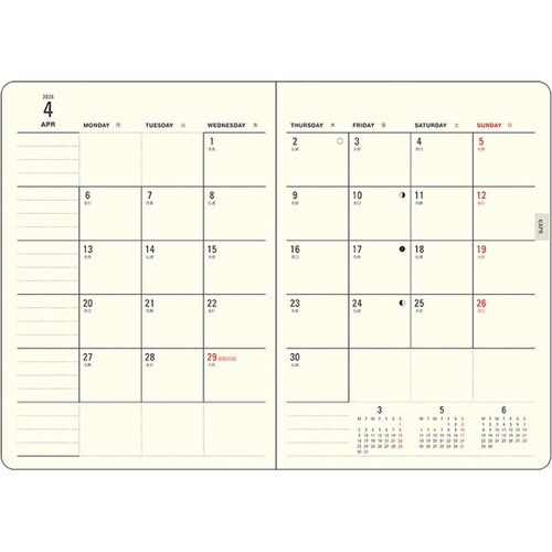 カバンの中でも紙の端が折れない角丸のフォルム、書き心地の良い手帳専用用紙を使用し、先まで見通せるミニカレンダーが付いています。