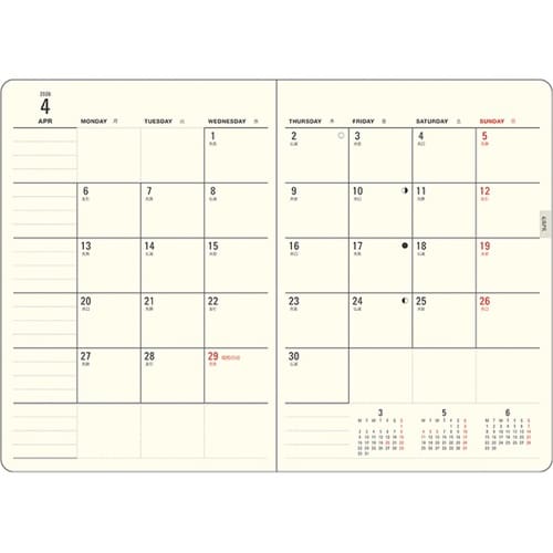 カバンの中でも紙の端が折れない角丸のフォルム、書き心地の良い手帳専用用紙を使用し、先まで見通せるミニカレンダーが付いています。