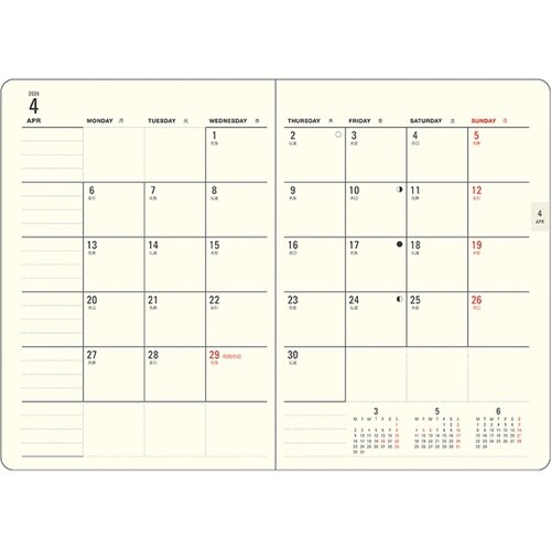 カバンの中でも紙の端が折れない角丸のフォルム、書き心地の良い手帳専用用紙を使用し、先まで見通せるミニカレンダーが付いています。