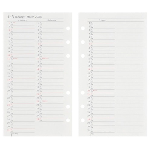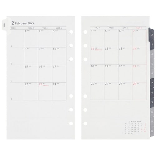 システム手帳に適したデータプラン”バイブルサイズ”シリーズ。月間ダイアリー見開き1ヶ月のカレンダースタイルです。 |