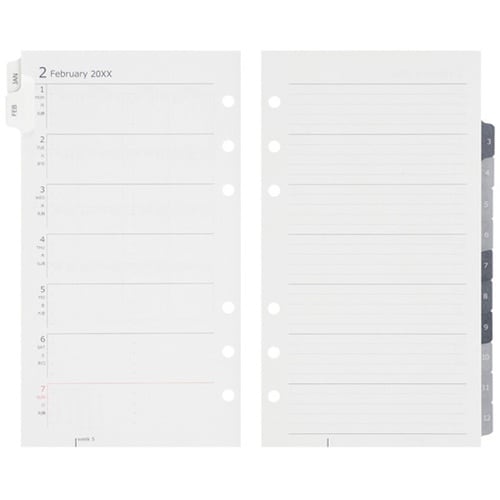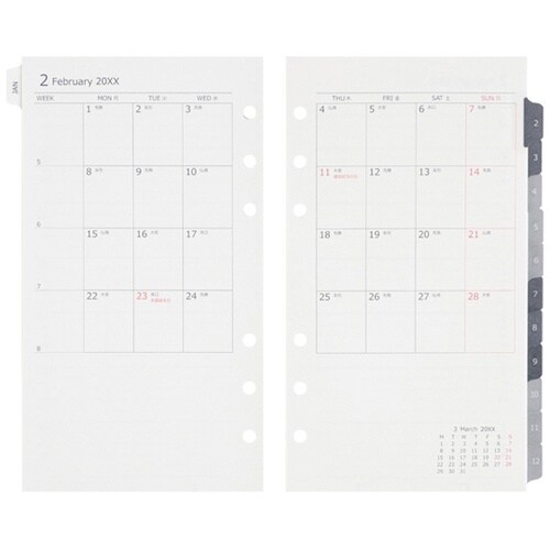 システム手帳に適したデータプラン”バイブルサイズ”シリーズ。月間+週間ダイアリーです。片面月間、片面週間です。 |